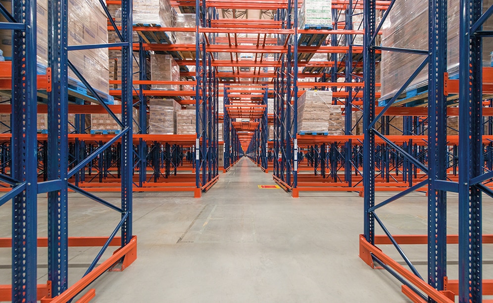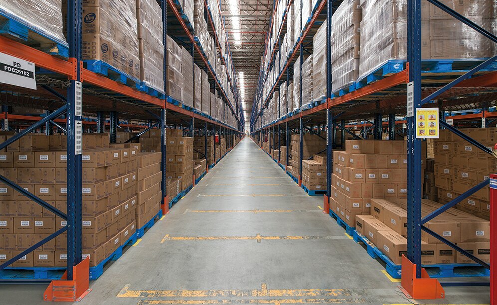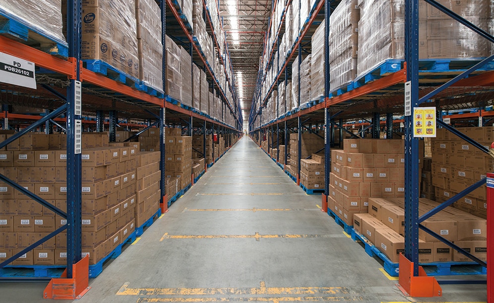Mecalux ha suministrado racks selectivos de simple y doble profundidad de 11,4 m de altura, con cinco o seis niveles, y 152 m de longitud. En total, presentan una capacidad de almacenaje para 83.569 tarimas de 1.000 x 1.200 mm.